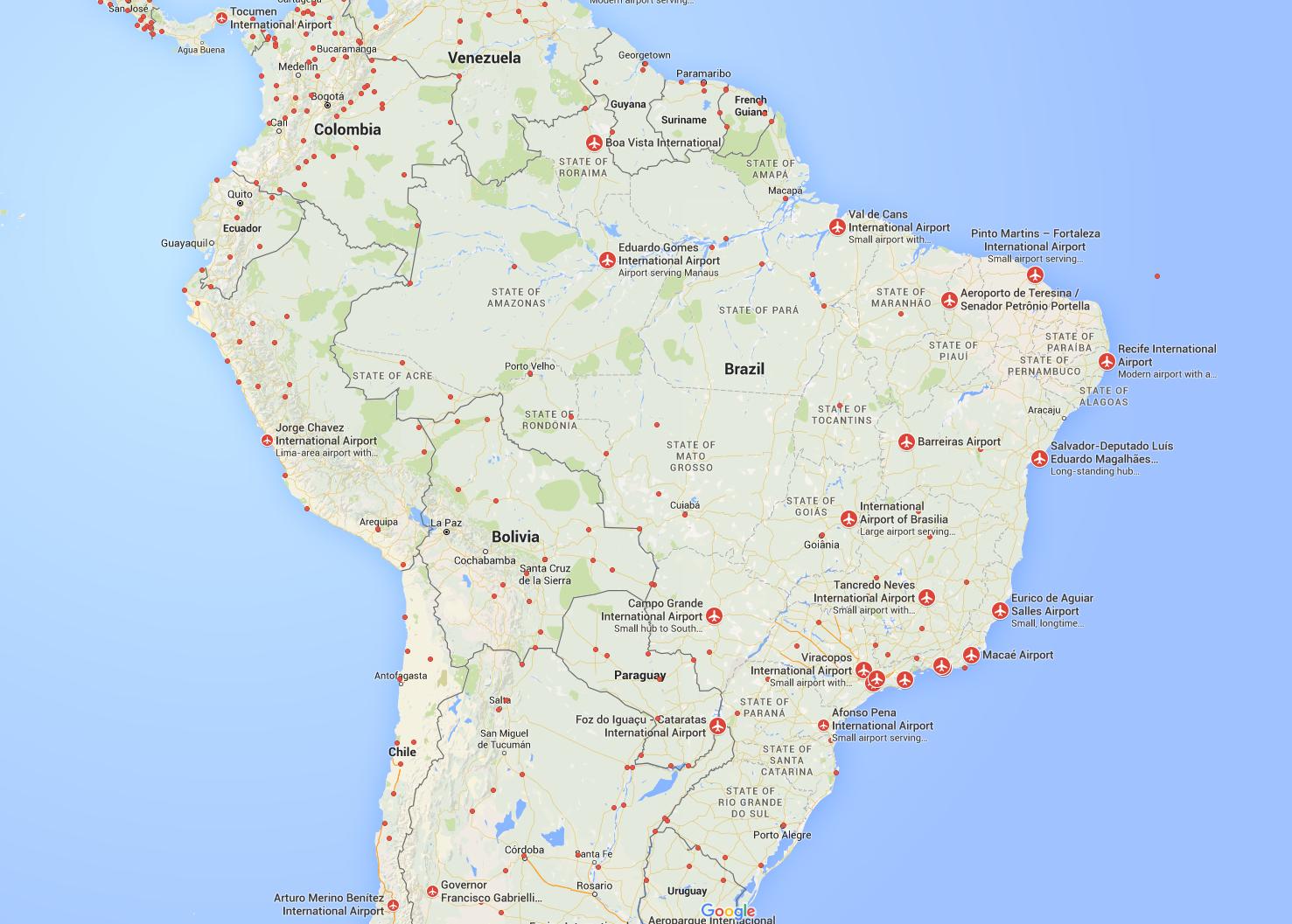De internationale luchthavens in de kaart van Brazilië. Brazilië internationale luchthavens kaart (Zuid-Amerika - Amerika) om af te drukken. Brazilië internationale luchthavens kaart (Zuid-Amerika - Amerika) te downloaden. Het luchtvervoer is sterk ontwikkeld. In 2001 vervoerden lokale en internationale luchtvaartmaatschappijen 34.285.600 passagiers. In 2001 waren er naar schatting 3.365 luchthavens, waarvan er 665 verharde start- en landingsbanen hadden. Van de 48 belangrijkste luchthavens zijn er 21 internationale luchthavens; de internationale luchthaven van Rio de Janeiro Galeao en de internationale luchthaven van Sao Paulo Guarulhos zijn veruit het actiefst, zoals blijkt uit de kaart van de Braziliaanse internationale luchthavens. De belangrijkste internationale luchtvaartmaatschappij is Empresa de Viaçao Aérea Rio Grandense (VARIG). Andere Braziliaanse luchtvaartmaatschappijen zijn Transbrasil Linhas Aéreas, Cruzeiro do Sul, (geassocieerd met VARIG sinds 1983), en Viaçao Aérea Sao Paulo (VASP), die alleen binnenlands verkeer verwerkt en wordt beheerd door de staat Sao Paulo. Alle maatschappijen behalve VASP zijn in particuliere handen.